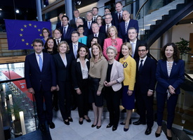 Csoportkép az Ursula von der Leyen, az Európai Bizottság elnöke vezette (első sor, b5) vezette új Európai Bizottság tagjairól az Európai Parlament plenáris ülésén tartott szavazás után Strasbourgban 2024. november 27-én. Harmadik sorban balról Várhelyi Olivér, az Európai Bizottságnak az egészségügyért és állatjólétért felelős magyar biztosa. Első sorban balról a negyedik Roberta Metsola, az Európai Parlament elnöke