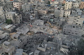 Összedõlt ház romjai között palesztinok a Gázai övezet déli részén fekvõ Hán-Júnisz menekülttáborban 2023. október 27-én.