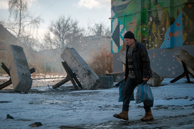 Tankelhárító akadályok mellett halad el egy helyi lakos a Donyecki területen fekvő, ostromgyűrűben lévő Bahmutban