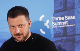 Volodimir Zelenszkij ukrán elnök a Három Tenger Kezdeményezés országainak csúcstalálkozójára érkezik Vilniusban 2024. április 11-én.