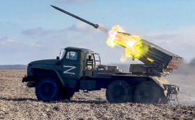 Az orosz védelmi minisztérium által videófelvételről készített és 2023. január 13-án közreadott képen orosz tüzérek 122 milliméteres BM-21-es Grad rakétavetővel tüzelnek a kelet-ukrajnai Donyecki területen