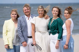 Vilmos Sándor holland király (b2) és Maxima királyné (k) három lányuk, a trónörökös Katalin Amália hercegnõ (b), valamint Ariane (j2) és Alexia (j) hercegnõk társaságában az Északi-tenger partján fekvõ Zuiderstrand tengerparti üdülõhelyen, Hága közelében 2023. június 30-án