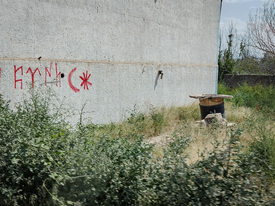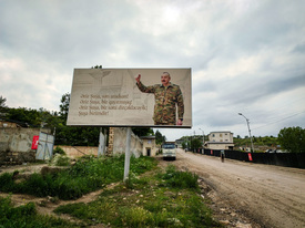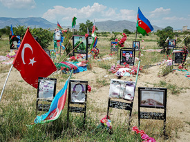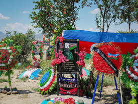 – Mindent úgy hagytunk, ahogy volt – jegyzi meg a kísérőnk. A rendeltetésüket vesztett, beomlott lövészárkok feszült csendje arról árulkodik, hogy itt nemrég ádáz harcot vívtak. Most egy zászlós emlékmű áll a halom tetején, állítólag nagyjából ezen a helyen estek el az első katonáik a hadműveletek megkezdésekor. Régen szőlősök terültek el a domb körül, ma már csak betonoszlopocskák merednek ki a földből, az örmények teleszórták aknákkal a területet. Ez Karabah egyik legnagyobb gondja: több ezer örmény akna, rejtett és saját gyújtószerkezetű eszköz maradt a földben, eltakarításuk legalább tíz évbe telik, és dollármilliókba kerül. Halállal teleszórt föld ez, amelyen még csak pislákol az élet.