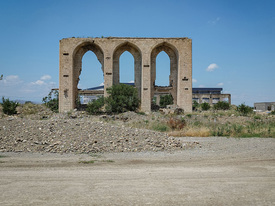Ağdam korábban virágzó település volt, a hármas árkád a város közepén szintén nem ókori emlék, hanem a színház romba dőlt épületének maradványa. A várost módszeresen elpusztították és lakhatatlanná tették, mert túl közel volt a tűzhöz, magyarán az azeri határhoz. Körös-körül tele van aknával (belső aknátalanítását nagyrészt befejezték), ottjártunkkor rengeteg aknakutató katona és szakember dolgozott a város határában. Némelyek lazán integettek, pedig ijesztő lehet a rejtőzködő halál közvetlen közelsége. A kormányzat helyi megbízottja fogad bennünket, körbekalauzol a romvárosban; látszik, hogy egykor szép épületek állhattak itt, és az is, hogy már szép épületek is állnak. Ideiglenes bázisukon ismerteti fejlesztési terveiket: a korábban 37 ezres Ağdamot újratervezik, és százezres okosvárosként építik újra.