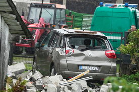 Dróntól megrongálódott autó a kelet-lengyelországi Lublini vajdaságban levő Wyryki településen 2025. szeptember 11-én