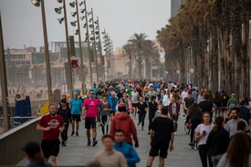 Sétáló és sportoló emberek egy tengerparti sétányon Barcelonában 2020. május 9-én