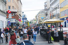 A nagy múltú Mariahilfer Strassén alig lehet német szót hallani a fesztiváli hangulatban hömpölygő tömegben. Mintha itt korzózna a földkerekség teljes lakossága. Bár nincs semmiféle rendezvény, egy gombostűt sem lehet elejteni, annyian özönlenek végeláthatatlanul a szemerkélő eső ellenére Bécs egyik leghosszabb és legismertebb bevásárlóutcájában. A teraszok megteltek vendégekkel, a büfék előtt sorban állnak. Hangos nevetés tör ki, amibe artikulálatlan hangorkán vegyül. Tányérok csörömpölése, ordítozás, dudálás hangja keveredik a bábeli nyelvzavarba. A német szó meglehetősen ritka, annál több az angol, a török, a szerb, de a magyar sem ritka. A bevásárlótáskát, bőröndöt toló, csomagot cipelő járókelőket rollerekkel száguldozó virtuózok kerülgetik a hatalmas forgatagban. A zsúfoltság, a zaj és a kosz egy ponton túl már szinte elviselhetetlen.