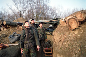 Katonák kémlelik az eget Eszéken a lövészárokból, légitámadás idején, 1991 decemberében