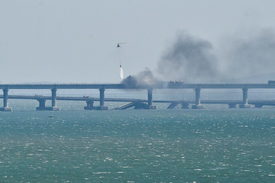 A Krími híd tüzét helikopterről oltják Kercs térségében 2022. október 8-án, miután az orosz Nemzeti Terrorizmusellenes Bizottság állítása szerint felrobbant egy teherautó az Ukrajnától elcsatolt Krímet és Oroszországot a Fekete- és az Azovi-tenger között összekötő átkelő közúti oldalán. Az útpálya érintett szakasza beomlott, a vasúti híd szerkezete is megsérült