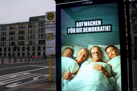 Ebben a bábeli forgatagban alig lehet észrevenni, hogy valójában egy országgyűlési választási kampány kellős közepén vagyunk. Február 23-án Németország új parlamentet választ. Csak az esőtől-széltől megtépázott, feltűnően kis méretű plakátok emlékeztetnek a közelgő eseményre, a közhangulatra inkább az apátia a jellemző.