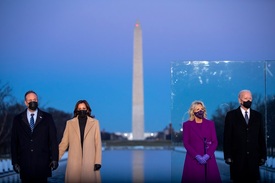 Joe Biden megválasztott amerikai elnök és felesége, Jill Biden, valamint Kamala Harris megválasztott alelnök és férje, Doug Emhoff részt vesz a koronavírus okozta Covid-19 betegségben elhunyt mintegy 400 ezer amerikairól rendezett megemlékezésen a washingtoni Lincoln-emlékmű tükörmedencéjénél 2021. január 19-én, egy nappal Biden beiktatása előtt