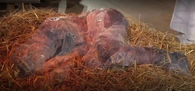A jászolban nem csecsemő feküdt, hanem egy nedves, magzatburokra emlékeztető kendőbe burkolt, összegömbölyödött felnőtt. Az alak meztelenül, sebezhetően és önmagába roskadva jelent meg.