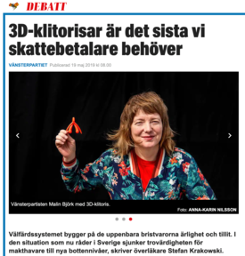 Nagy visszhangot keltett a svéd és a nemzetközi sajtóban 2019-ben, hogy Malin Björk svéd európai parlamenti képviselő, a Baloldali Párt politikusa az EP-től kapott reprezentációs keretéből 150–200 háromdimenziós műanyag klitoriszt rendelt.