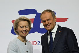 Donald Tusk, az Európai Unió soros elnöki tisztségét betöltõ Lengyelország miniszterelnöke (j) és Ursula von der Leyen, az Európai Bizottság elnöke a biztosi testület ülése után tartott sajtótájékoztató végén a gdanski Európai Szolidaritás Központjában 2025. február 7-én.