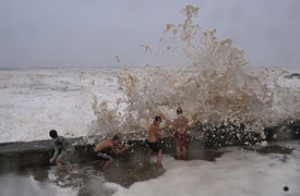 A Korall-tenger magasra csapó hullámainak habjában mártóznak meg emberek az ausztráliai Gold Coastban 2025. március 7-én.