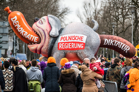 Elvetették a sulykot a düsseldorfi farsangozók. Az egyik, teherautóra épített installációjuk egy hatalmas kutyát ábrázolt, melynek az oldalára azt írták: lengyel kormány. A kutya hatalmas kolbászt evett, amin az a felirat díszelgett, hogy demokrácia. S egy hosszú, barna kutyakaki állt ki a fenekéből, erre pedig azt pingálták: diktatúra…