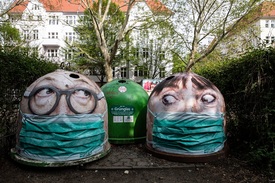 Védőmaszkos arcokat ábrázoló szelektív hulladékgyûjtõ edények Berlinben a koronavírus-járvány idején, 2020. április 29-én