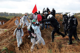 Rendőrök és a szénkitermelés ellen tüntető környezetvédő aktivisták a Hambach külszíni bányánál. Fotó: MTI/EPA