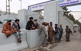 Iszlamista tálib fegyveresek őrködnek a kabuli Hamid Karzai Nemzetközi Repülőtér elõtt 2021. szeptember 1-jén