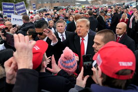 A Republikánus Párt elnökjelöltségéért kampányoló Donald Trump volt amerikai elnök támogatóit köszönti a New Hampshire állambeli republikánus párti elõválasztáson Londonderryben 2024. január 23-án.