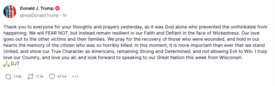 „Nem hagyhatjuk, hogy a gonosz győzedelmeskedjen” – üzente a republikánus párti elnökjelölt-aspiráns, aki azt is írta, hogy „csakis Isten akadályozta meg, hogy megtörténjen az elképzelhetetlen”.