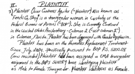 Első keresetét Merrick Garland volt amerikai igazságügyi miniszter ellen 2024 elején elutasították. Nem sokkal később kezdte magát “transznemű nőként” azonosítani, hormonkezelést kért, és női börtönbe való áthelyezésért küzdött. 2024 augusztusában a BOP ellen is panaszt nyújtott be, amelyben többek között női fehérneműt, sminket, hajfestéket és egyéb kozmetikumokat követelt, azt állítva, hogy ezek hiánya “öngyilkosságba sodorhatja”.