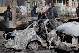 Kiégett járművek roncsai egy bombatámadást követően Kijevben 2022. február 28-án