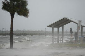 Emberek a közelgő Nicole hurrikán által okozott viharban a Florida állambeli Jensen Beach településen 2022. november 9-én