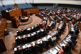 Képviselők szavaznak Finnország NATO-csatlakozásáról a parlament üléstermében, Helsinkiben 2023. március elsején