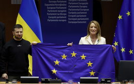 Volodimir Zelenszkij ukrán elnök (b) és Roberta Metsola, az Európai Parlament (EP) elnöke az Európai Unió zászlóját tartja az uniós parlamentben, Brüsszelben 2023. február 9-én, az Európai Tanács brüsszeli ülésének idején