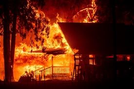 A közelben pusztító erdőtüzek miatt lángra kapott egy ház a kaliforniai Janesville közelében 2021. augusztus 16-án