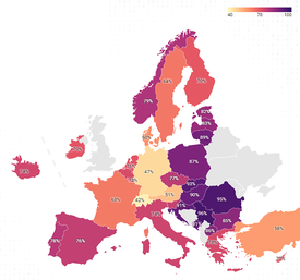 Eközben Szlovákiában és Romániában az emberek 95, Szerbiában és Magyarországon 92, Horvátországban, Montenegróban 91 százaléka saját tulajdonú lakásban él, de jelentős a saját lakástulajdon aránya Litvániában (89) és Lengyelországban is (87 százalék). Közép-Európa után a Dél következik: Olaszországban a saját lakással rendelkezők aránya 74,3, Portugáliában 78, Spanyolországban 76 százalék. Aztán ahogy haladunk nyugat, majd észak felé, az arány tovább csökken. Belgiumban a lakosság 72 százaléka él saját tulajdonú lakásban, Hollandiában 68,8, Franciaországban 63,1, Svédországban 64,9, Finnországban közel 70 százaléka, utóbbi megegyezik az EU átlagával.