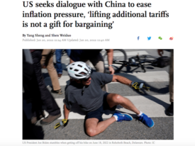 A Global Times, a Kínai Kommunista Párt hivatalos kiadványa természetesen valójában nem a Delaware államban történt biciklis mutatvánnyal foglalkozott. Cikkükben ehelyett azt állítják, hogy a Biden-kormányzat a Donald Trump korábbi elnök alatt bevezetett vámok feloldását próbálja elérni Pekingnél, ám az Egyesült Államok a kommunista vezetés szerint nincs tárgyalásra alkalmas állapotban.