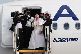 Amikor felsétált a lépcsőn a Rómába tartó repülőgépre, a Szentatya egy kisebb széllökéstől pillanatra láthatóan kibillent az egyensúlyából, de a személyzet egyik tagja segített neki a fedélzetre lépnie.