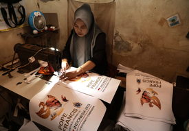 Ferenc pápa közelgõ indonéziai látogatására készítenek textilzsákokat a Gerhamedia cég üzemében, a Banten tartománybeli Tangerang nagyvárosban 2024. augusztus 28-án.