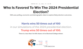 Az egyik legnagyobb és legtöbbet hivatkozott amerikai választási esélyelemző, a FiveThirtyEight az október 22-én lefuttatott 1000 szimuláció alapján majdnem pontosan fele-fele esélyt lát arra, hogy Trump vagy Harris nyeri el a győzelemhez szükséges elektorszámot és ezzel az elnöki tisztséget, és 0.3 százalékpontos esélyt arra, hogy az eredmény döntetlen lesz.