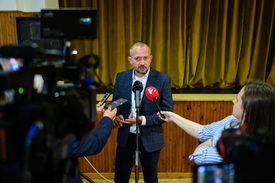 Gyopáros Alpár, a modern települések fejlesztéséért felelős kormánybiztos beszél a Fidesz és a KDNP országjárása keretében tartott lakossági fórum előtti sajtótájékoztatón Apostagon 2025. április 23-án
