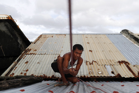 Fülöp-szigeteki férfi hullámpalával fedett tetőt erősít meg, mielőtt a Mangkhut tájfun lecsap. Fotó: MTI/EPA