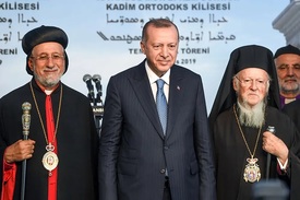 Recep Tayyip Erdoğan elnök szír egyházi vezetőkkel egy isztambuli templom alapkövének letétele alkalmával 2019-ben