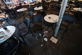 Törött poharak és tányérok egy kávézóban Bécs belvárosában 2020. november 3-án