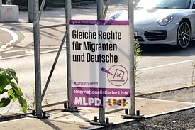 “Azonos jogokat migránsoknak és németeknek” - ezt követeli plakátain a német Marxista-Leninista Párt (MLPD).
