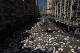 Tiltakozók több helyen úttorlaszokat állítottak fel Hongkongban hétfő reggel, komoly fennakadásokat okozva a reggeli csúcsforgalomban, Molotov-koktélt dobtak a helyi érdekű vasút egyik kocsijába, valamint egyetemi épületekben tettek kárt – olvasható a Hszinhua kínai állami hírügynökség tudósításában.