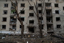 Orosz légicsapásban megrongálódott lakóépület a Harkiv régióban lévõ Lukjanciban 2024. április 16-án.