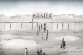 A rövid rajzfilm videó címe: Eurodame, Help! Nyitányként egy migráns férfi látható, hidzsáb-fedte nejével és két fiúkkal, akik egy nagy fal kapujához közelednek. A kapu fölött a felirat: FRONTEX.