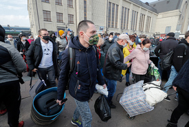 Moszkvából érkező ukrán utasok érkeznek egy kijevi vasútállomásra 2020. március 29-én.