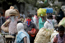 Kendővel védik arcukat indiai férfiak a kolkatai zöldségpiacon 2020. április 15-én, a koronavírus idején.