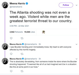 Március 22-én Denver elővárosában, Boulderben egy férfi tíz ártatlan embert, köztük egy rendőrt lőtt agyon a King Soopers szupermarketben. Az elkövetőről először csak egy elmosódott felvételt tettek közzé. Meena Harris író, ismertebb szerepében az amerikai alelnök unokahúga a tragédiáról azon nyomban megosztotta gondolatait a Twitteren: