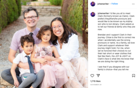 Jennifer Chen, egy Los Angeles-i anyuka nagy visszhangot váltott ki, amikor az Instagram közösségi portálon egy családi fotón jelentette be, hogy kislányát, Claire-t ezentúl Clarknak hívják, és nőnemű helyett többes számú (semleges nemű) névmással nevezi meg magát.