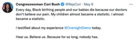 A demokraták felügyelőbizottsága előtt megtartott beszédében a Missouri államból delegált baloldali kongresszusi képviselőnő, Cori Bush többek közt a következőket mondta: „A gyermeket szülő fekete személyek és a fekete kisbabák naponta halnak bele abba, hogy az orvosok nem hisznek a fájdalmunkban.” Minderre annak kapcsán jutott, hogy nagyon nehéz terhességekkel kellett megbirkóznia, az egészségügyi ellátórendszerben szerzett tapasztalatai pedig szerinte rendszerszintű rasszizmusra utaltak. Ezért a harcias politikus megígérte, mindent megtesz majd azért, hogy a jövőben megvédje a „fekete anyákat, a fekete babákat, a fekete szülő személyeket”.