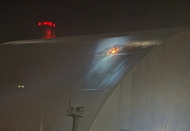 A Nemzetközi Atomenergia-ügynökség, a NAÜ felvétele a csernobili atomerőmű 4-es reaktorát védő betonburok, úgynevezett szarkofág tetején ütött lyukról 2025. február 14-én
